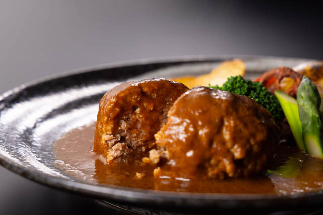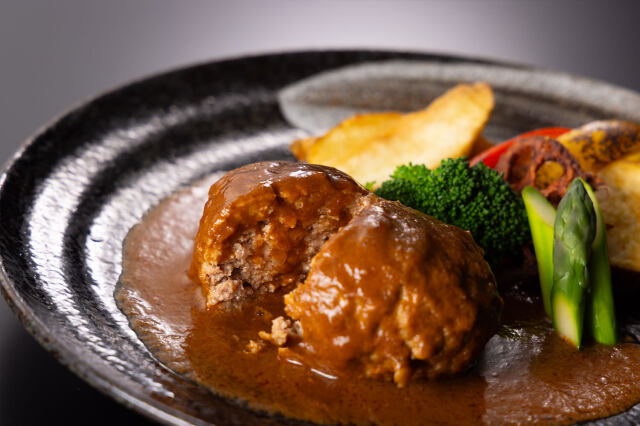 みかく牛70%・国産豚肉30%を合挽にし特製のデミグラスソースで煮込みハンバーグにしました。